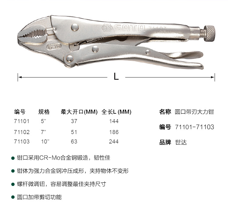 世达SATA圆口带刃大力钳71101/71102/71103 71102(规格:7“ 开口:51mm )