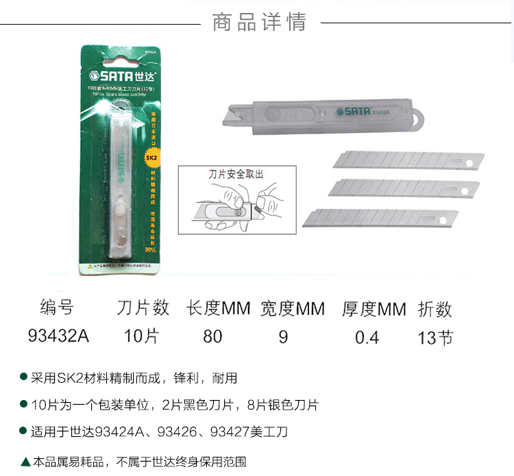 世达工具进口美工刀壁纸墙纸刀安全开箱刀裁纸10件刀片93432A