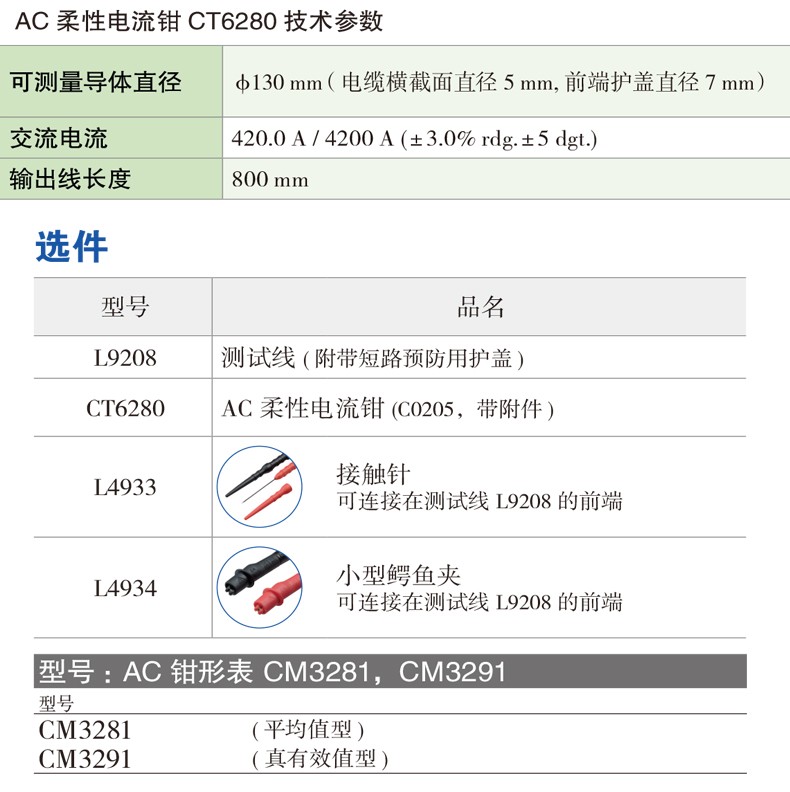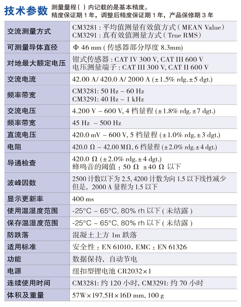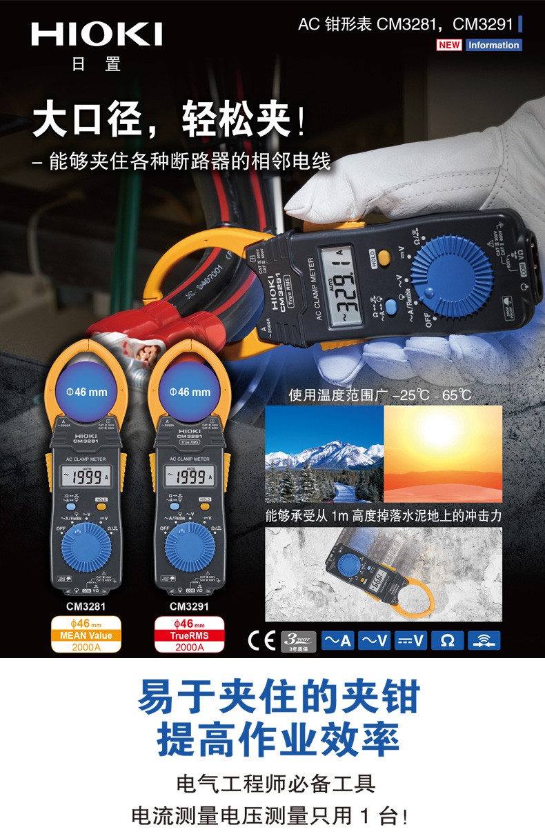 HIOKI日置CM3281 CM3291钳形表 机身轻薄 高精度电流钳表 2000A钳口细小 CM3291