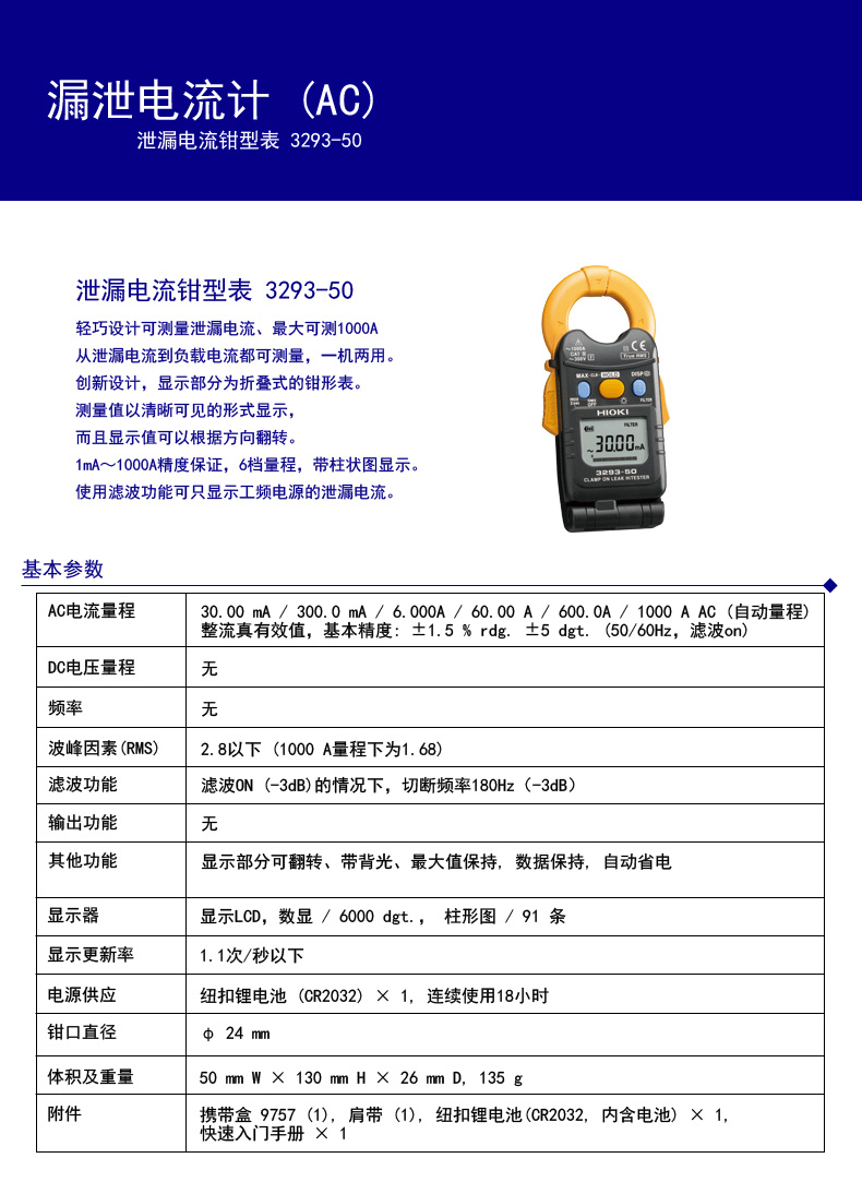 日置(HIOKI)电流表钳型万用表 3293-50泄漏电流钳形表