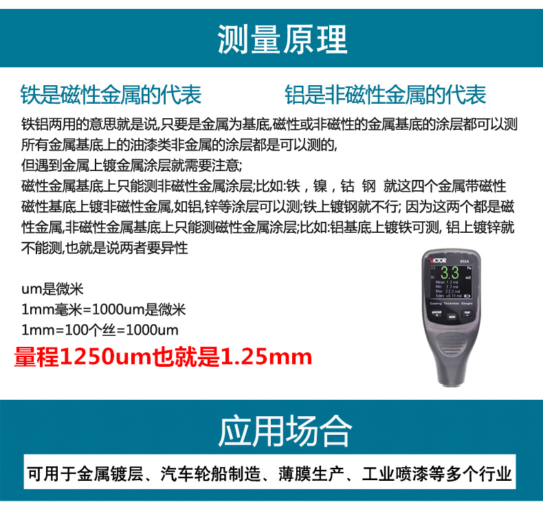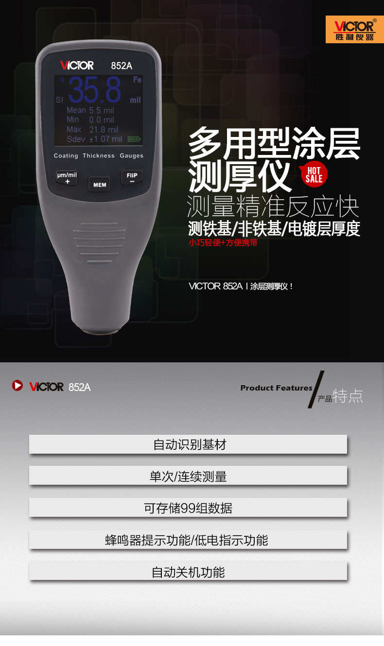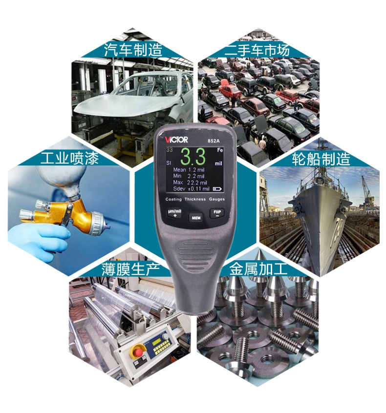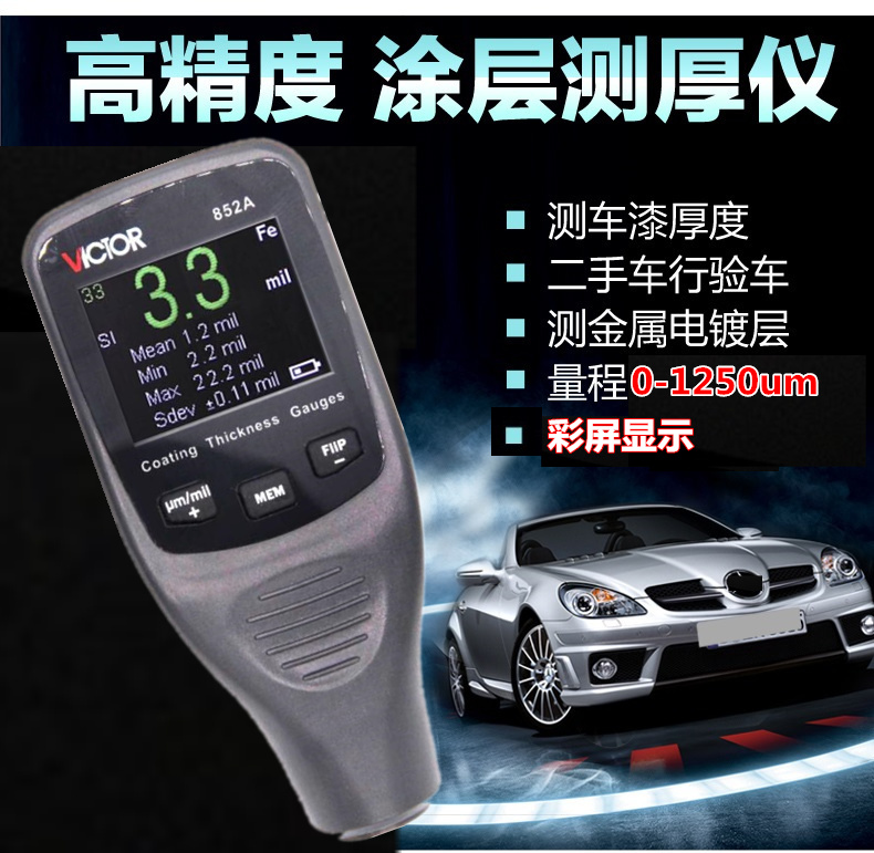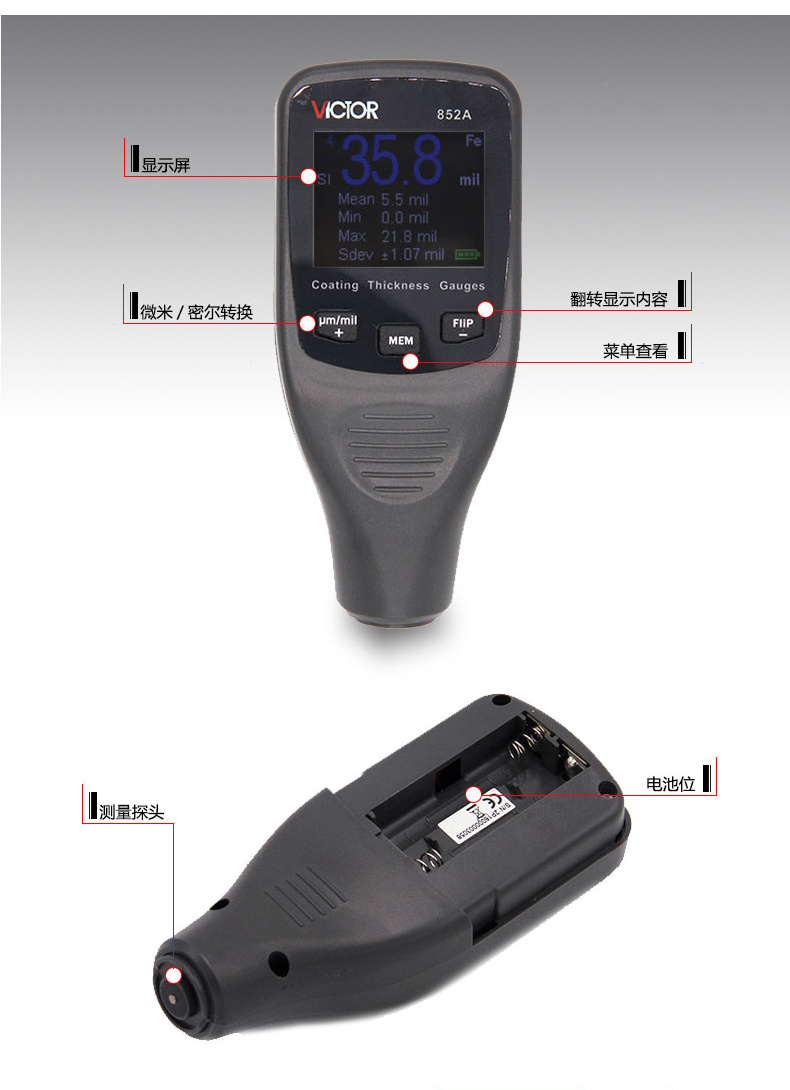 VICTOR胜利仪器VC852A铁铝两用涂层测厚仪漆膜仪镀锌层汽车漆面检测仪油漆厚度测量仪